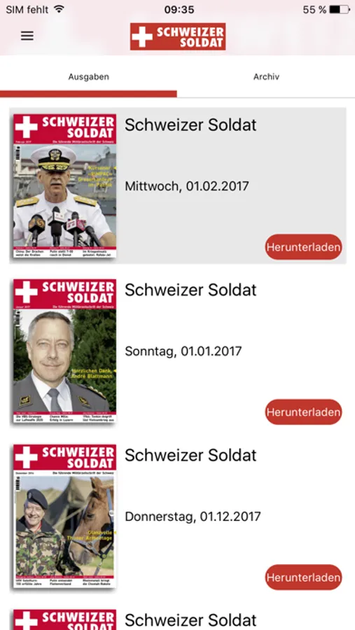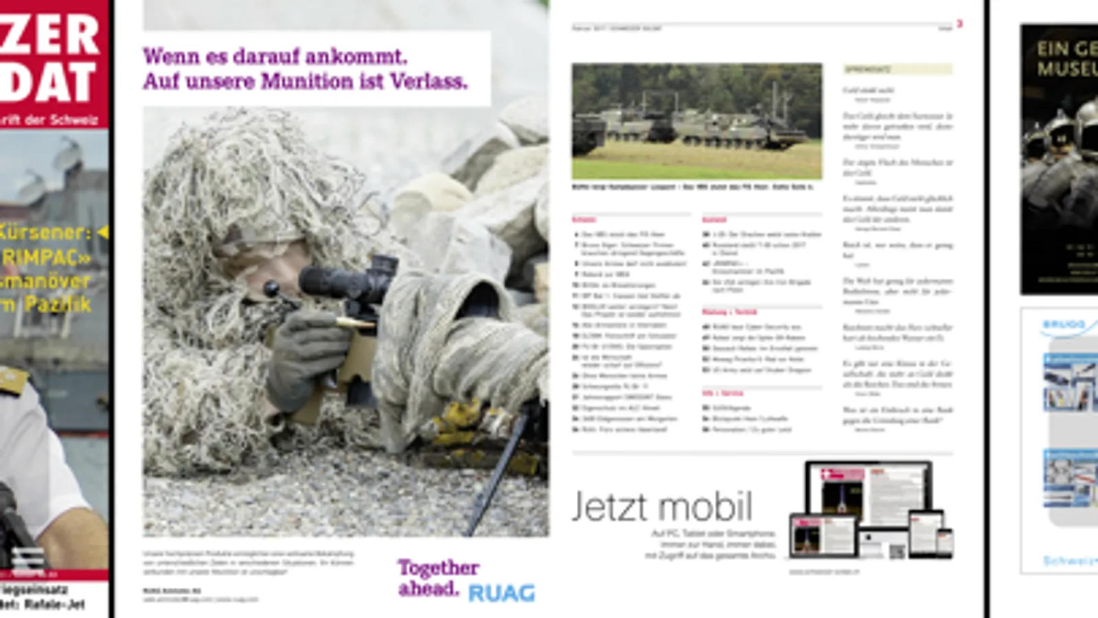 Die „Tablet“-App SCHWEIZER SOLDAT umfasst die komplette Print-Ausgabe. Inhalte und Inserate können in einer vergrösserten, gut lesbaren Form angeschaut werden. Der Download der „Tablet“-App ist kostenlos. Mit dabei ist eine ältere Test-Ausgabe SCHWEIZER SOLDAT zum Probelesen.