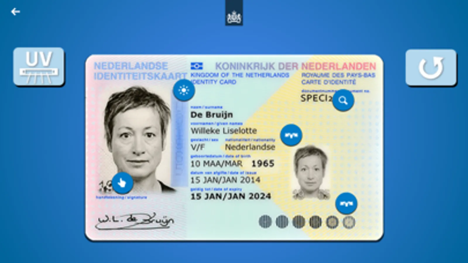 Deze app informeert je over echtheidskenmerken die zijn toegepast in paspoorten en op identiteitskaarten, documenten voor vreemdelingen en rijbewijzen. De app laat je zien waar de echtheidskenmerken staan en door je toestel te kantelen, tegen het licht te houden of aan te raken, ontdek je hoe ze werken.