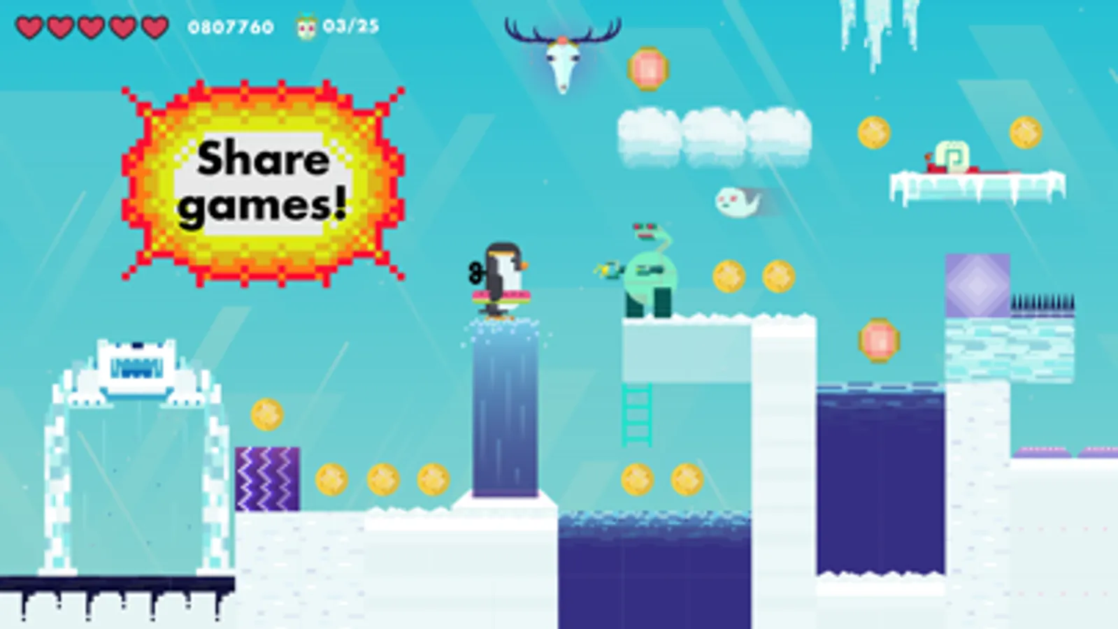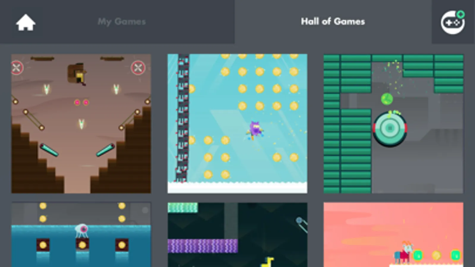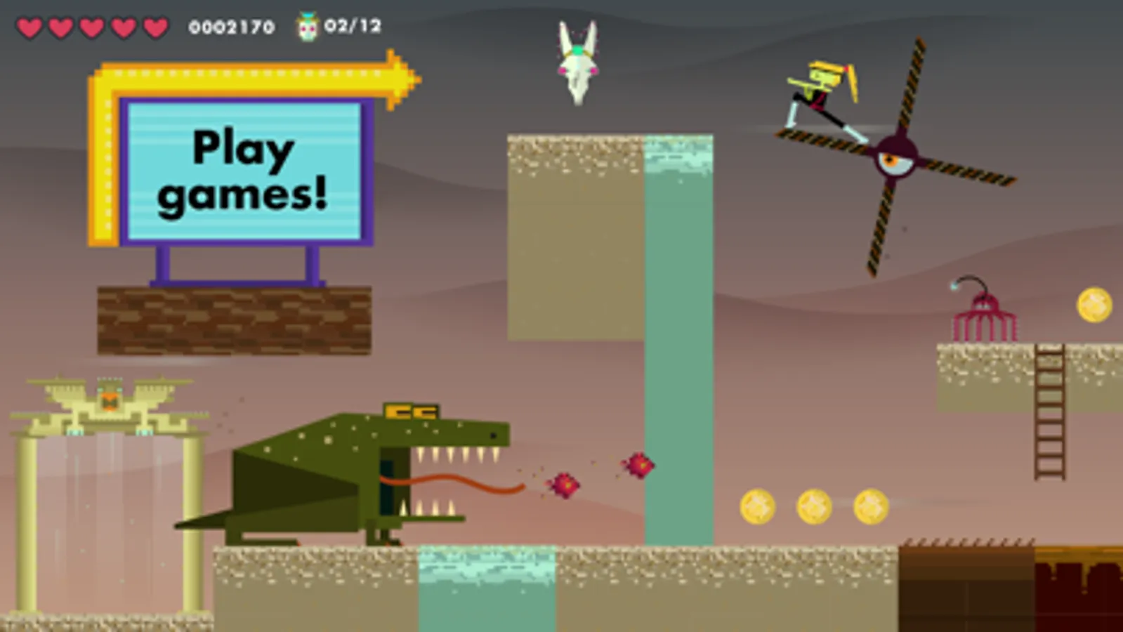 Let the gaming begin! Can you play as well as you make? Now’s the time to see. Run on a travelator, jump over hot lava, swim through water, and find the victory portal. Attack zombies, evil snails, and electromagnetic cats. Collect all the gold coins and glittery skulls. Is your game too easy? Go back and make it harder. Set the high score record!
