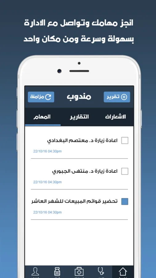 مع تطبيق مندوب، لا حاجة بعد اليوم الى ارسال الايميلات اليومية الى المشرفين، ولا حاجة لبذل جهود مضاعفة لقراءة وتوحيد التقارير العشوائية المرسلة بشكل يومي عبر الايميلات. سيوفر لك التطبيق واجهة موحدة لاستلام وقراءة التقارير واستخراج المعلومات المهمة والمفيدة على شكل تقارير مفصلة، كما يوفر للمندوبين واجهة تواصل ذكية وعالية التقنية مع شركاتهم.