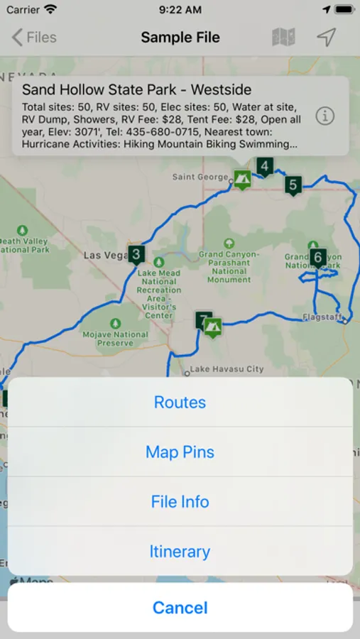 - includes a map image with pins and routes, activities for each Route Pin, costs for each activity, total fuel cost, total trip cost, information for Points of Interest Pins, and driving instructions.