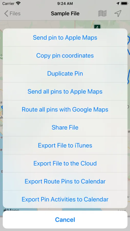 - view driving distance between pins, driving time, fuel cost, travel advisories, turn-by-turn driving directions