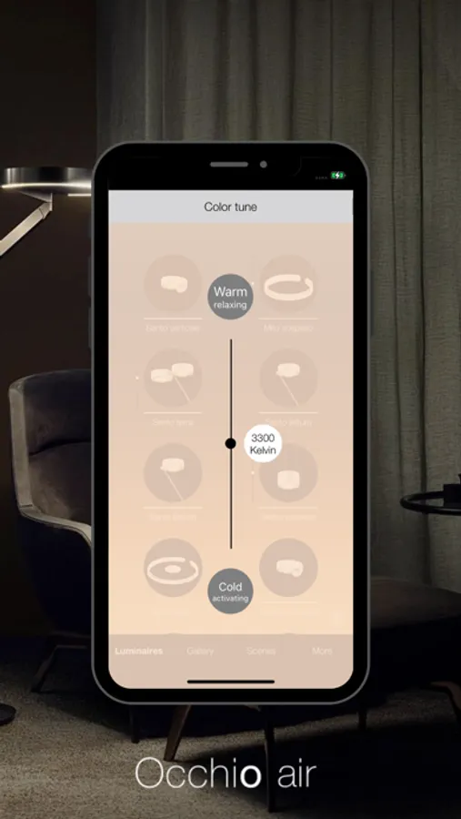 Occhio air modules can be connected to any trailing-edge phase cut dimmable luminaire. They can then be switched on/off and dimmed with the app.