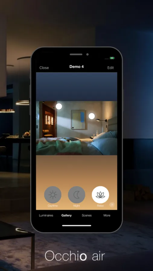 The gallery lets you experience lighting control in a very special, intuitive way: Simply take a picture of your room and select the luminaires in the image that you want to control. You'll be able to control your light right from that image!