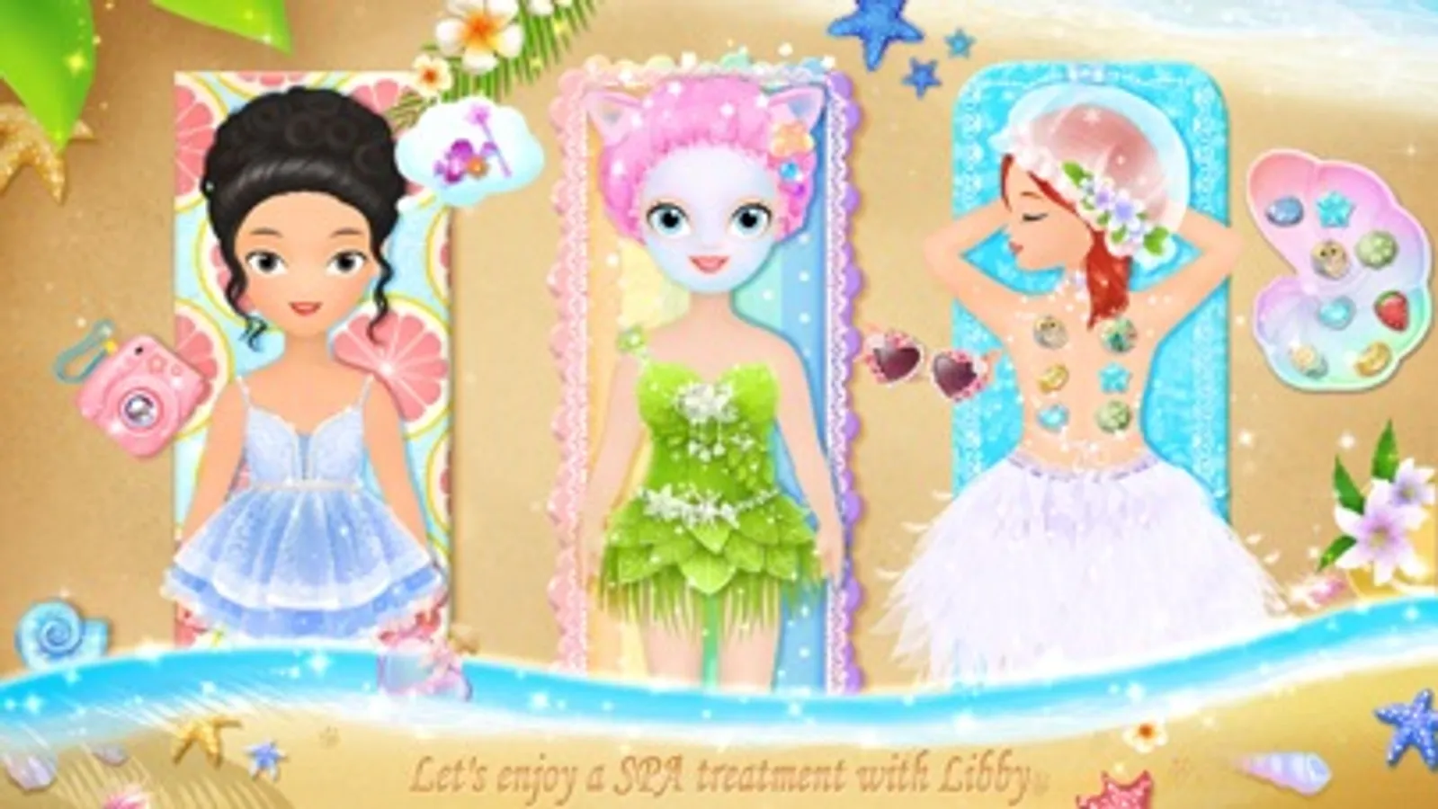 Open the game, and you'll see this fantastic place! Can't wait to play, huh? Take it easy, sweetie. Let's get Libby changed first. Walk into the fashion house, choose your favorite outfits from the right side, and at the bottom you can invite some adorable animals to the room. All right, let's head out to the endless fun now. Well, it's too hot outside, if only there is a hand fan. Why not make one of your own? First, you gotta put the frames in the right places, and then select your favorite fan leaves, guards and a pendant. Want the fan to be even more special? Then decorate it. Bravo, let's embrace a cool holiday. If you like, you can be a real beach cooking chef, and treat your friends with delicious food. Feeling tired? Come on, it'll be an extraordinary experience to get a spa treatment by the sea. Popsicles, fishing, cotton candy, fishtail... Let's enjoy many more fun right now.