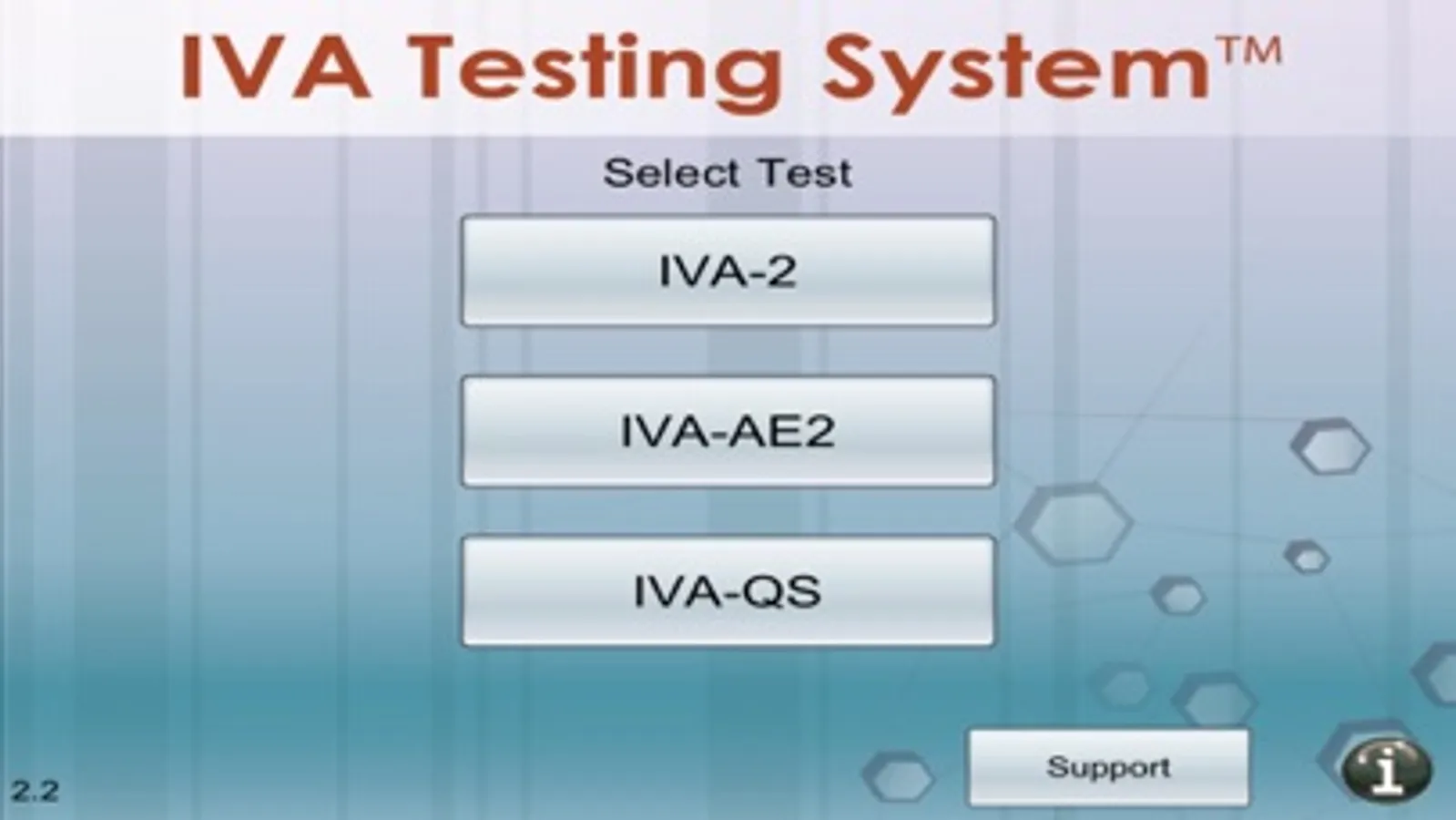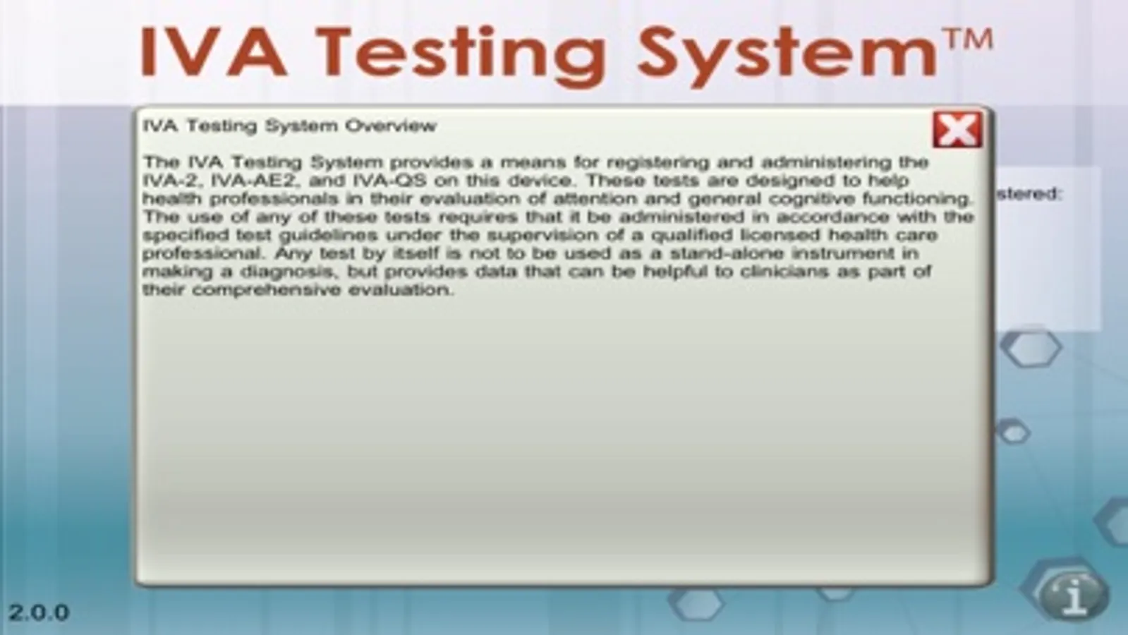 The IVA Testing System is a decision support software for use only by healthcare professionals who have expertise in the use and interpretation of psychological tests. This system supports the remote administration of the IVA-2, IVA-AE2, and IVA-QS on this device. These tests can only be administered, scored, and interpreted by qualified healthcare professionals as part of a comprehensive evaluation. Individuals taking the test have no direct or immediate access to any test results or data.