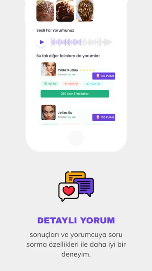 Artık uygulama üzerinden gerçek yorumcularımıza sesli olarak kahve falınızı yorumlatabilirsiniz. Yapmanız gereken sadece falınızı yollarken “sesli fal” bölümünü işaretlemek. Hem de bu hizmet için ekstra bir hizmet ödemek zorunda kalmazsınız!