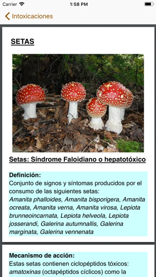 La APP ANTÍDOTOS, “Guía de antídotos en intoxicaciones agudas” está organizada en 31 capítulos cada uno de los cuales hacen referencia a un tipo de intoxicación concreta y contiene la siguiente información detallada: