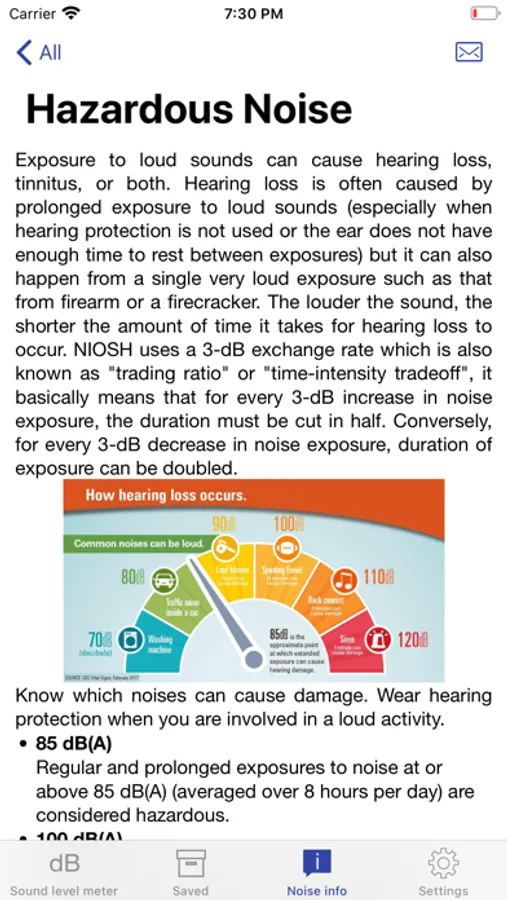 - Up-to-date informational screens on what noises are considered hazardous, how to conduct a noise measurement, how to properly select a hearing protector, and guidelines for preventing hearing loss, all at the palm of your hand.