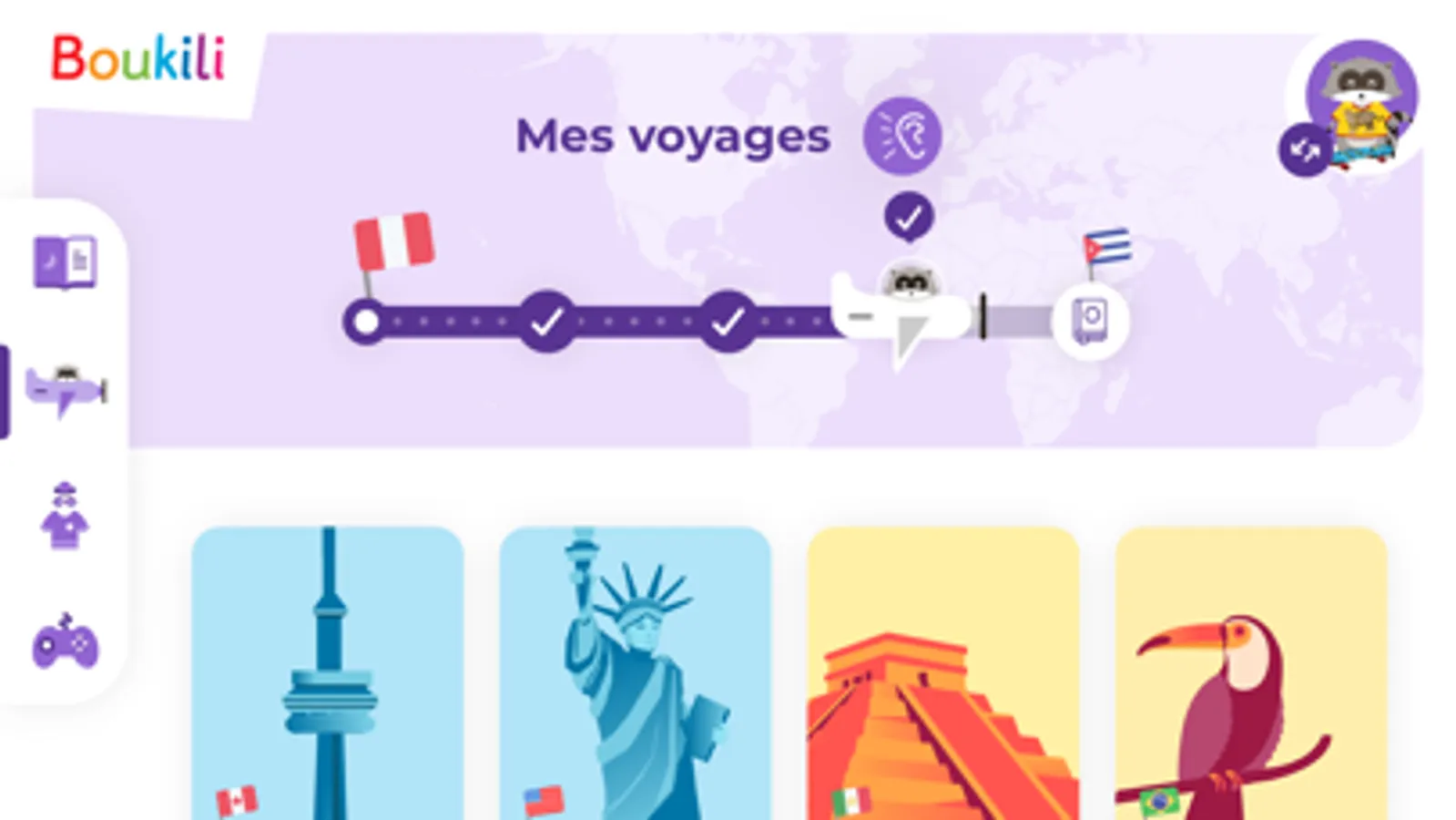 Boukili makes learning to read fun by offering quizzes and a cute avatar to customize. The theme of travel is ever-present, with the possibility of unlocking countries to discover. Children gain confidence while discovering the wonderful world of reading!