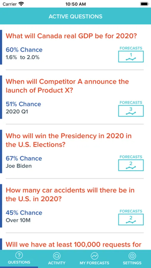 Cultivate Forecasts is an app for making predictions about future events. Forecasting tournaments help you gather anonymous predictions from your organization about potential outcomes to events that effect strategic decisions. You can then measure the accuracy of those forecasts to improve judgment and accountability.