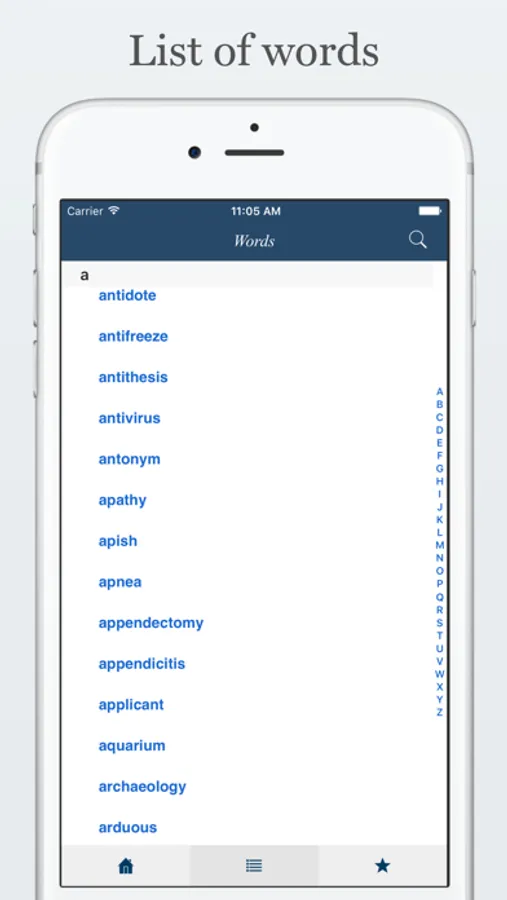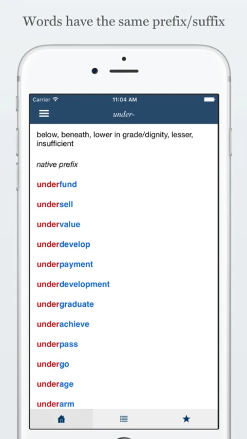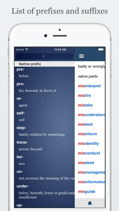 This app will provide you with a comprehensive reference for the English prefixes and suffixes. You can also find a list of words that derive from the same prefix or suffix.