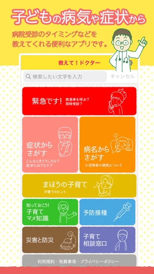 本アプリの記載内容は、佐久医師会監修の冊子「教えて!ドクター 子どもの病気とおうちケア」(https://oshiete-dr.net/pdf/home_care2021.pdf)に基づいて掲載されております。