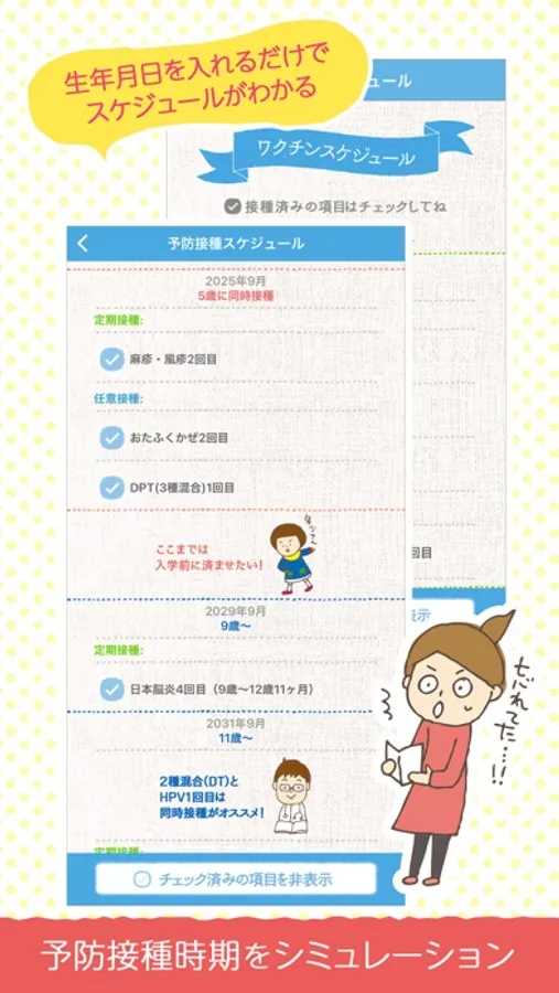 ・生年月日を入力すると接種ワクチンのスケジュールを月別に表示