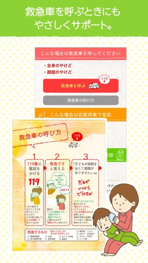 ・咳や発熱など、症状を選択すると、救急受診の目安(すぐに救急車か、自家用車か、翌日以降でよいか)を表示