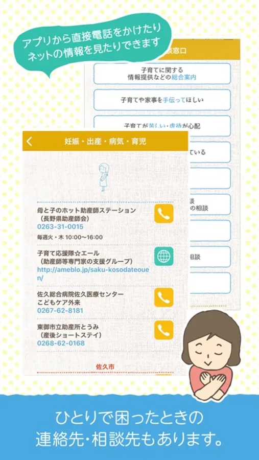 ・子育て相談窓口一覧(佐久地域)あり、直接電話が掛けられます。