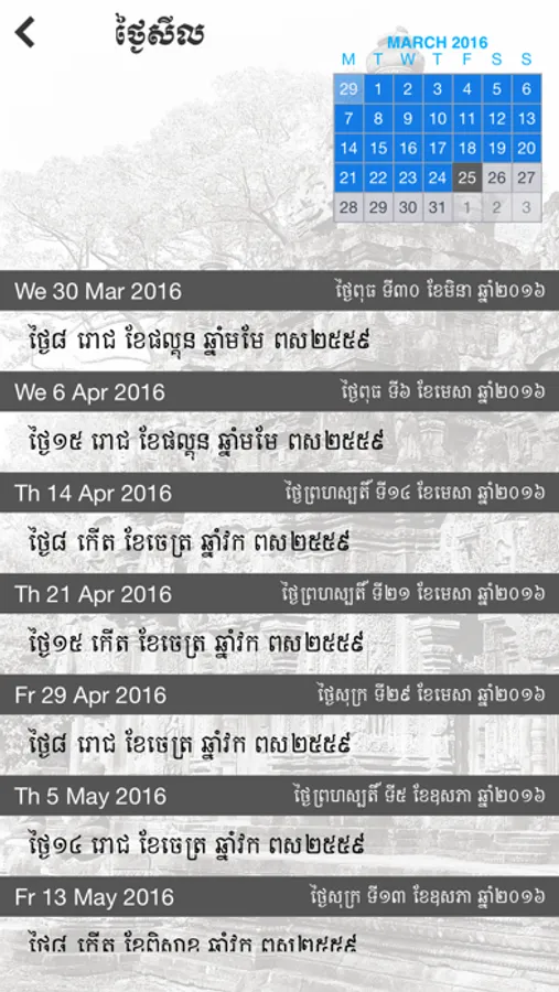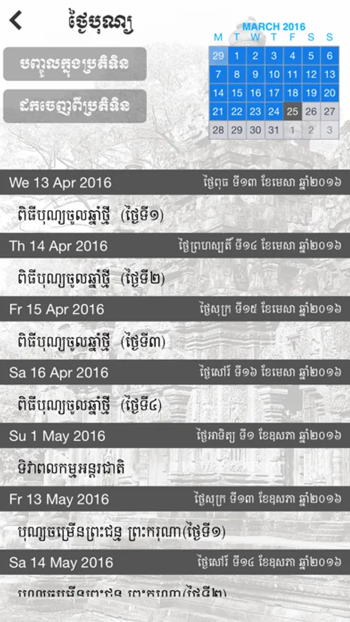 - Current month and date plus Khmer Calendar in detail.
