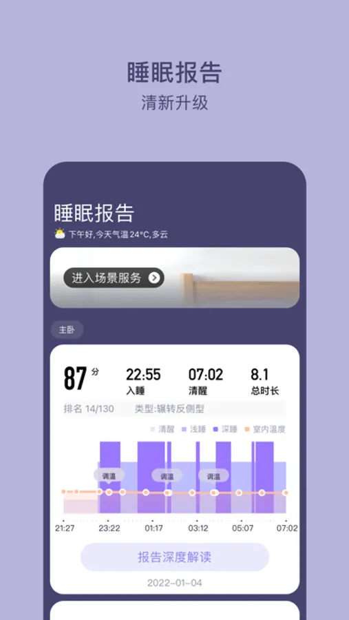 采集精品助眠音乐,并细分焦虑、失眠、小憩等专区,助您快速放松;联动卧室的智能设备,如香薰机、空调、加湿器、灯、窗帘、按摩止鼾枕等设备,根据上床、入睡、浅睡、深睡、起夜、起床等睡眠情况自动调节,时刻保持优质睡眠环境。