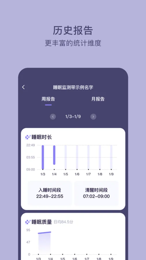 从睡眠测试、设备监测开始,所有睡眠相关数据于云端进行记录存储并分析,生成睡眠报告与建议,呈现每日/每周/每月的睡眠情况。