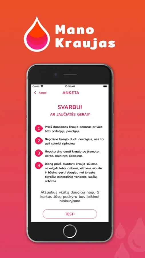 Programėlės tikslas – skatinti neatlygintiną kraujo donorystę, palengvinti registracijos kraujo donorystei procesą bei suburti neatlygintinų kraujo donorų bendruomenę.