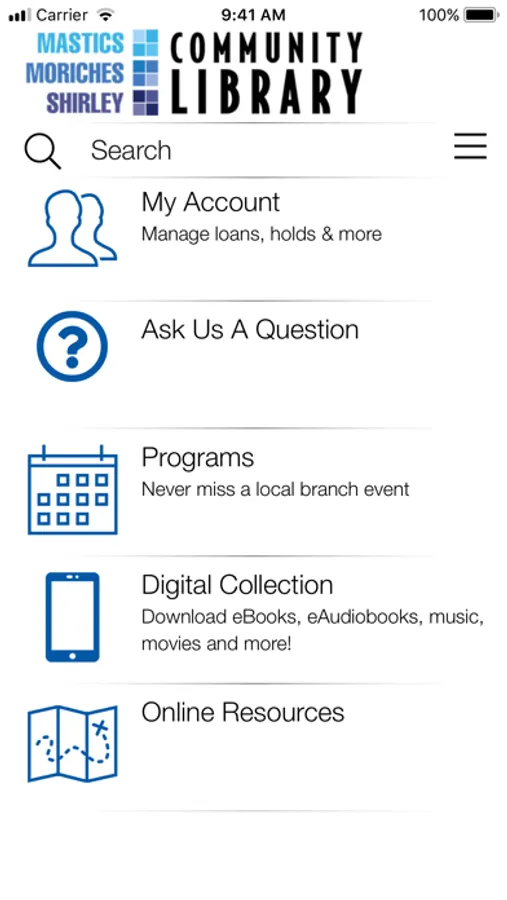 MMSCL, the mobile app for Mastics Moriches Shirley Community Library, lets you locate and search your library catalog wherever you are. If you are a library card holder in and of the Mastics Moriches Shirley Community Library below, you can locate books, movies, music and more with easy search features designed for Mobile devices.
