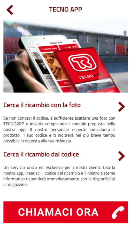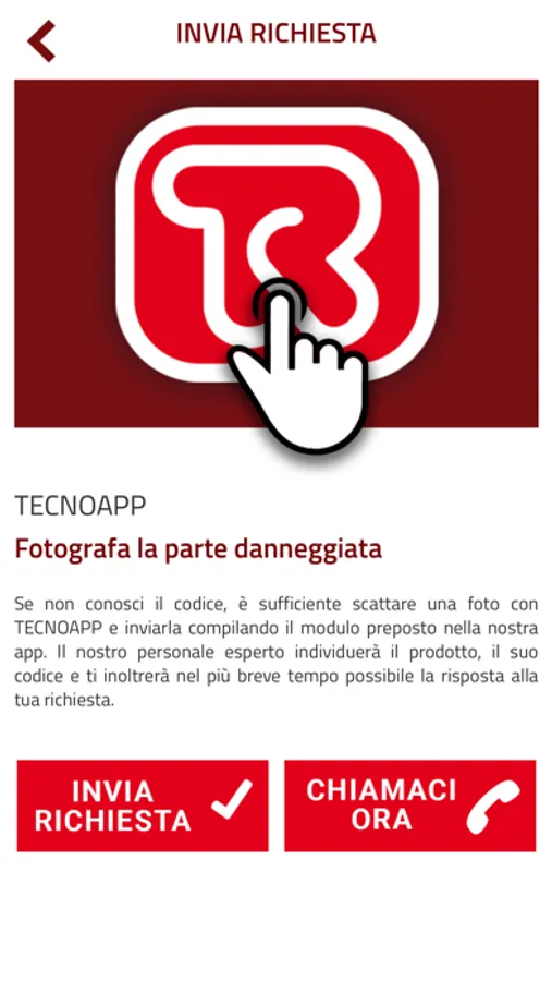 Se non conosci il codice, è sufficiente scattare una foto con TECNOAPP e inviarla compilando il modulo preposto nella nostra app. Il nostro personale esperto individuerà il prodotto, il suo codice e ti inoltrerà nel più breve tempo possibile la risposta alla tua richiesta.