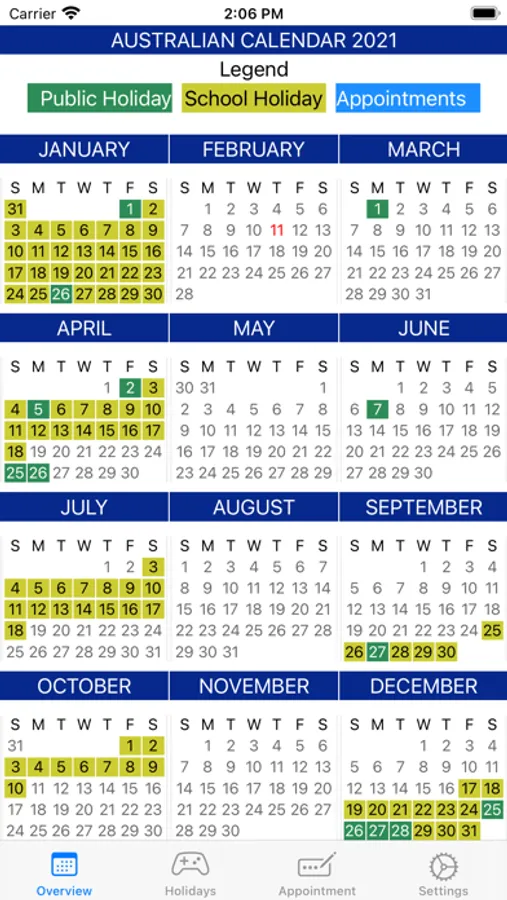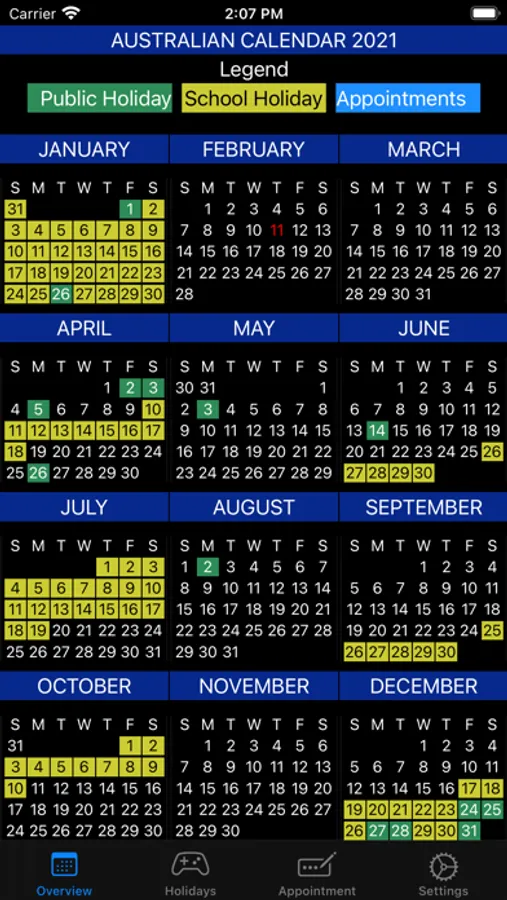 A comprehensive calendar app to view Australian Public and School Holidays in a glance. Australian Calendar 2021 Pro lets you filter and view the holidays according to states and types of holiday. You can also add and manage your appointments which will be reflected in the home page, together with the Public Holidays and School Holidays colour codings.