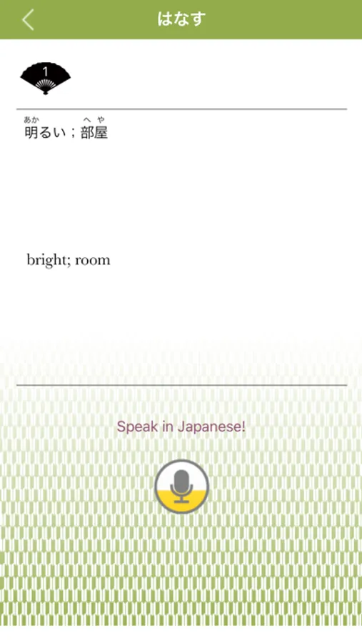 Use the [Speaking] はなす function to form sentences in accord with the displayed contents by using grammar learned in a lesson. Touch the Microphone icon to begin voice recognition, and then say the sentence out loud toward the screen. The voice recognition software will check whether the sounds spoken are correct or not.