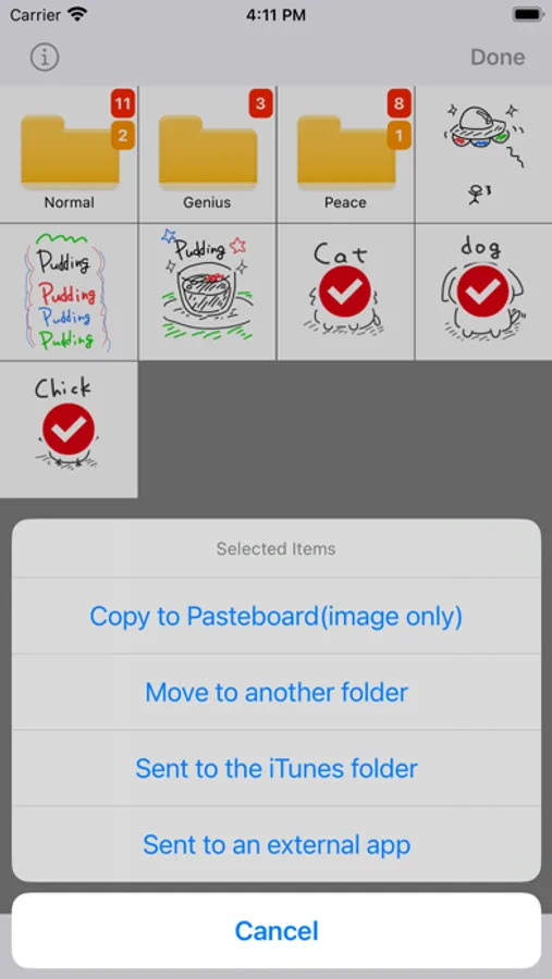 Collected image to a folder, you can export to iTunes shared folder and other Cloud apps.