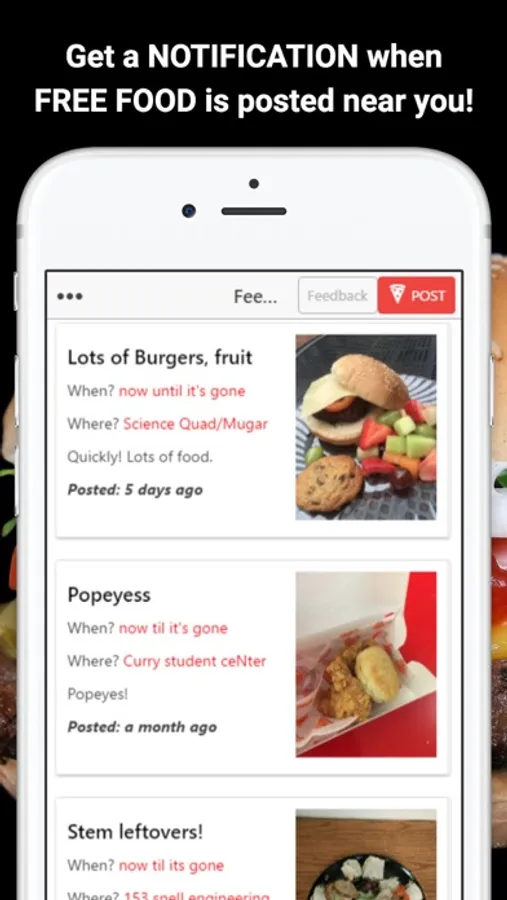 FeedShare lets university students find food on campus. Download today to get instant notifications whenever food is posted near you!