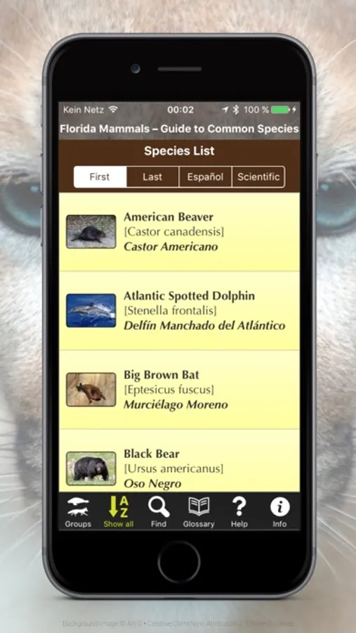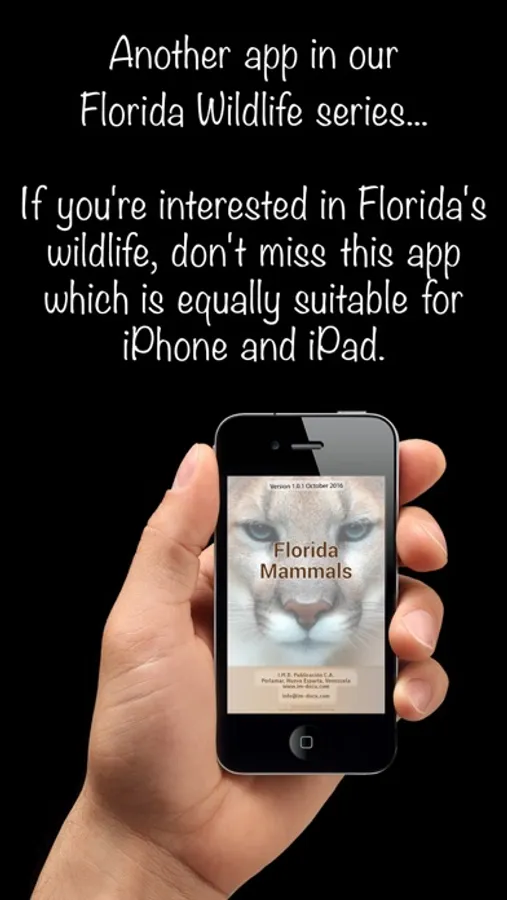 This app shows more than 100 mammal species found in Florida, including the Everglades National Park and the Gulf and Atlantic coast. For each animal there are two or more high-resolution pictures, a brief description, and a link to view the corresponding Wikipedia pages within the application window. All descriptive information is in English, the animal names are also shown in scientific (Latin) denomination and in Spanish.