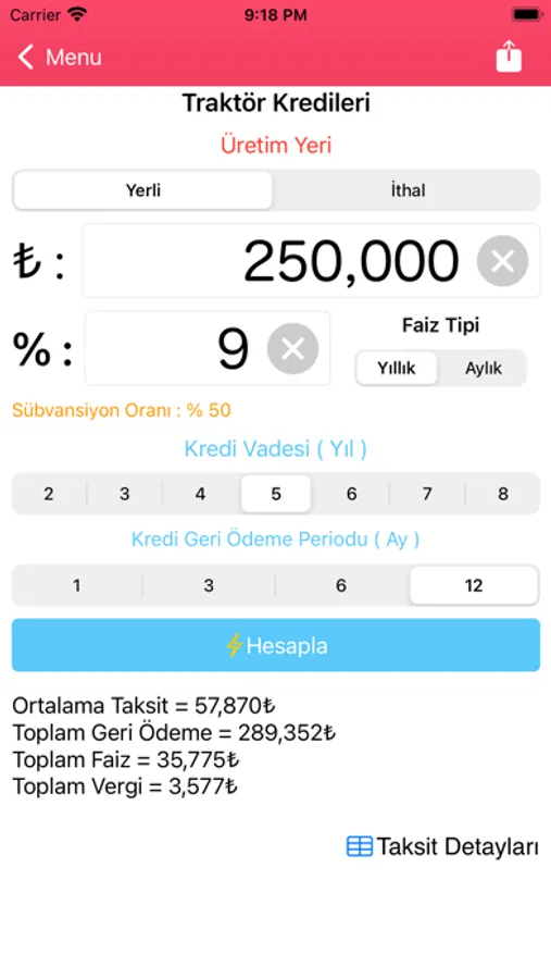 Sabit Faizli Traktör Kredisi; 5 yıla kadar vade ve 1, 3, 6, 9 ve 12 şer aylık taksitler halinde geri ödeme hesaplama yapmaktadır.