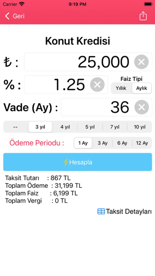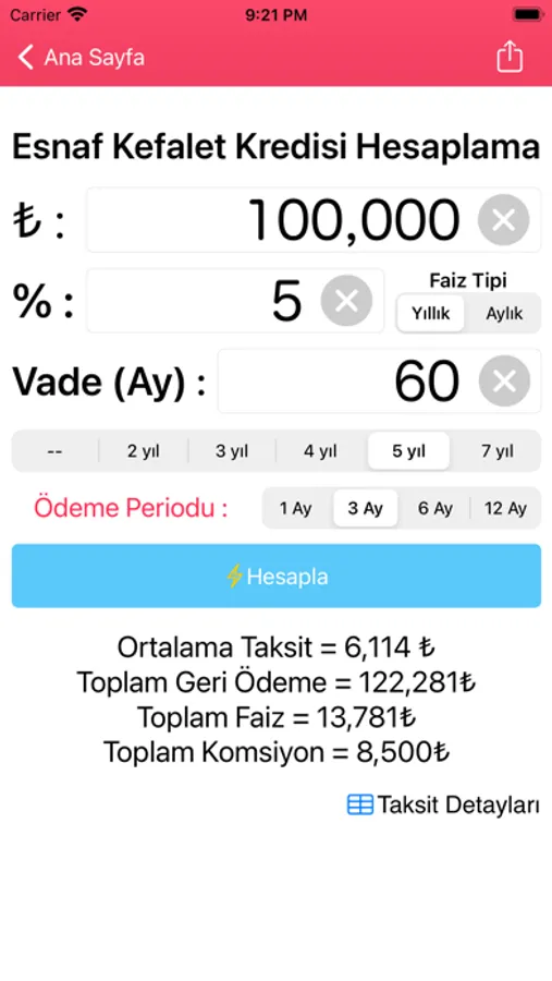 Ticari, Bireysel, Zirai ( Tarımsal - çiftçi ) kredi geri ödeme ( taksit ) planları hesaplaya bileceğiniz bir araç. Taksitleri 1, 3, 6, 12 aylık dönemler ( period ) halinde hesaplayabilirsiniz.