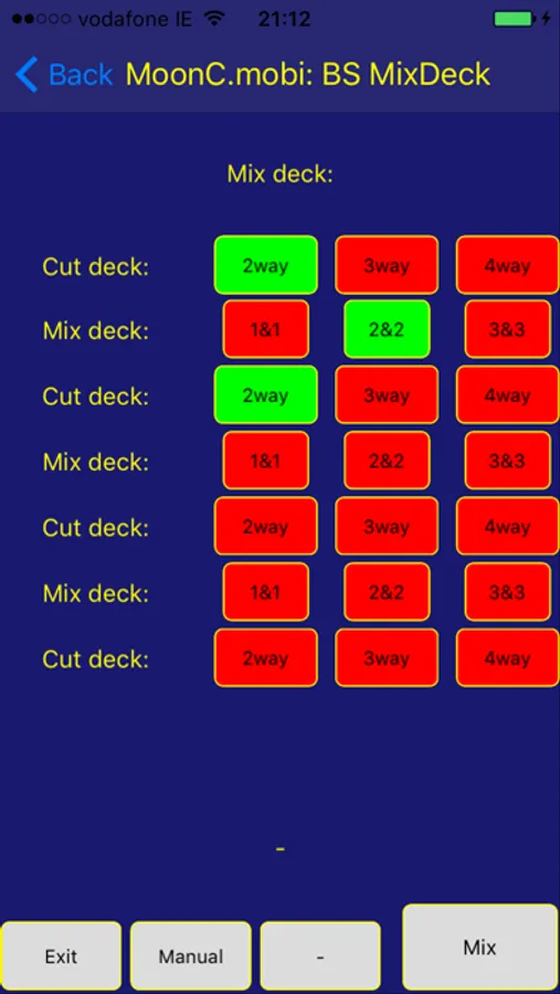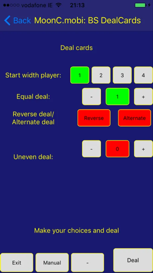 One of the players shuffles and deals the cards to the other players; 16 each if 2 players, 17 if 3 and 12 if 4. Shuffling and dealing is automatic, but you decide on a combination of methods and orders to mix things up.