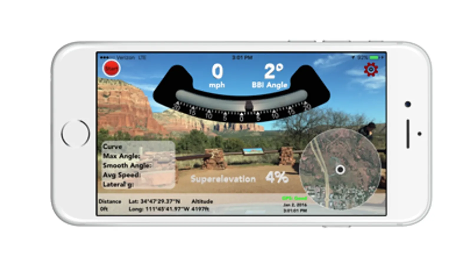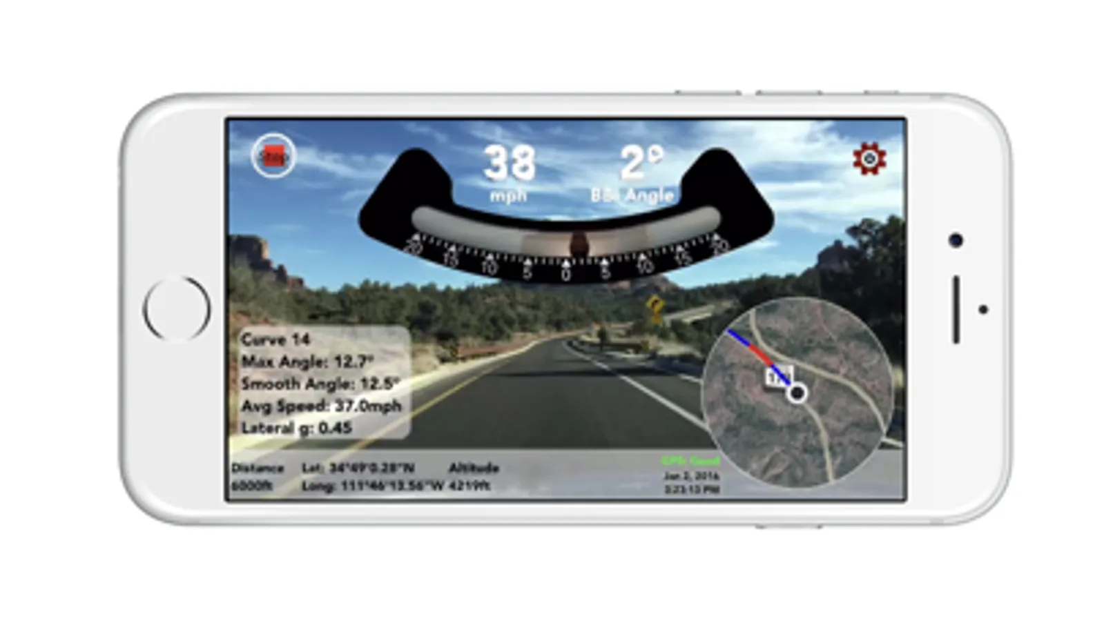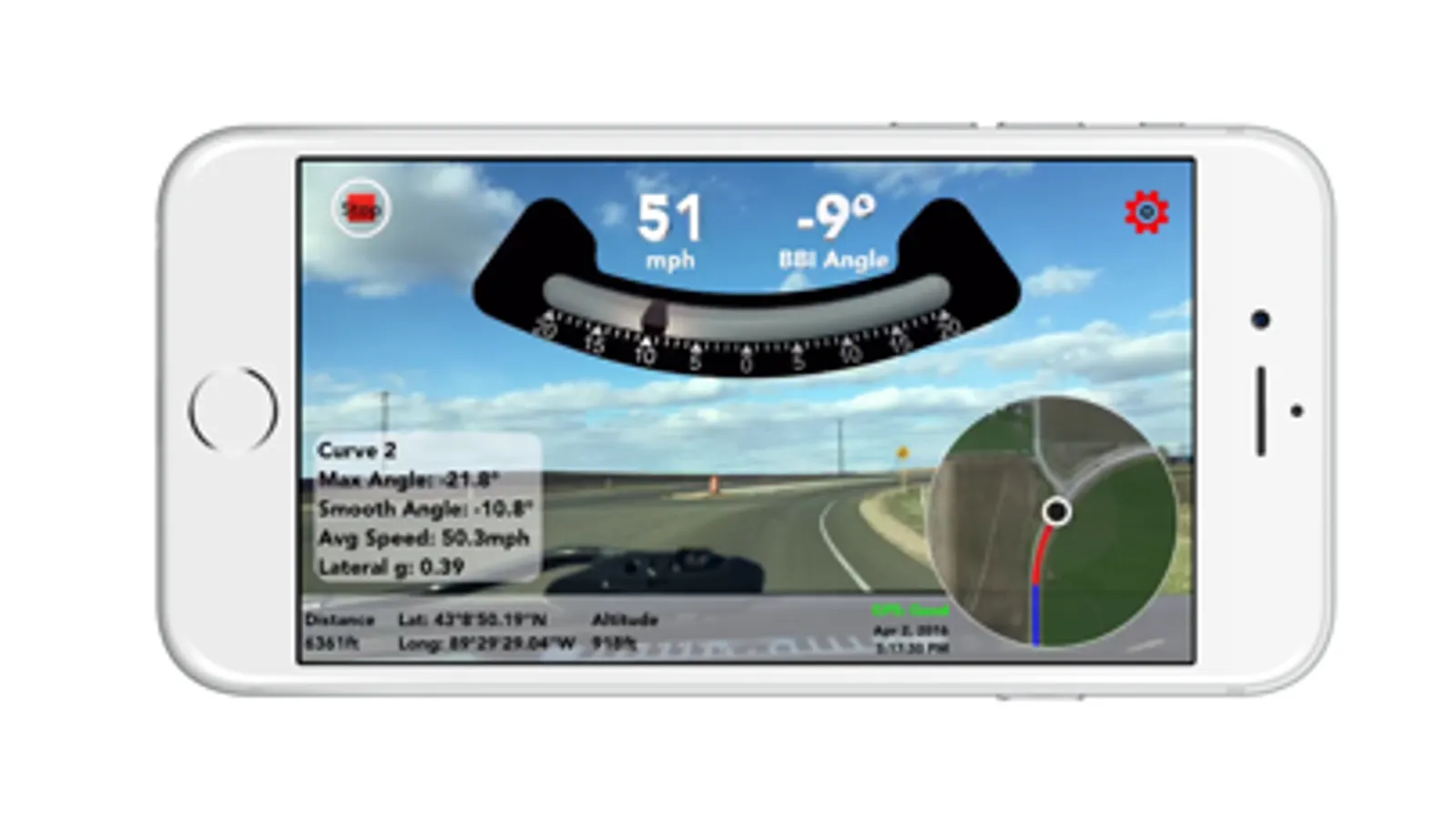 Ballbank not only shows you the continuous angle reading and speed, but calculates the maximum smooth angle, average speed, and lateral g force for every curve. Linear distance, lat/long, altitude, date, and time are all recorded too. The map makes it easy to see exactly where all of the data was collected.