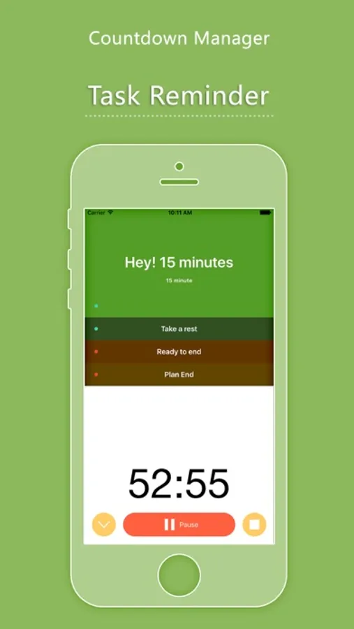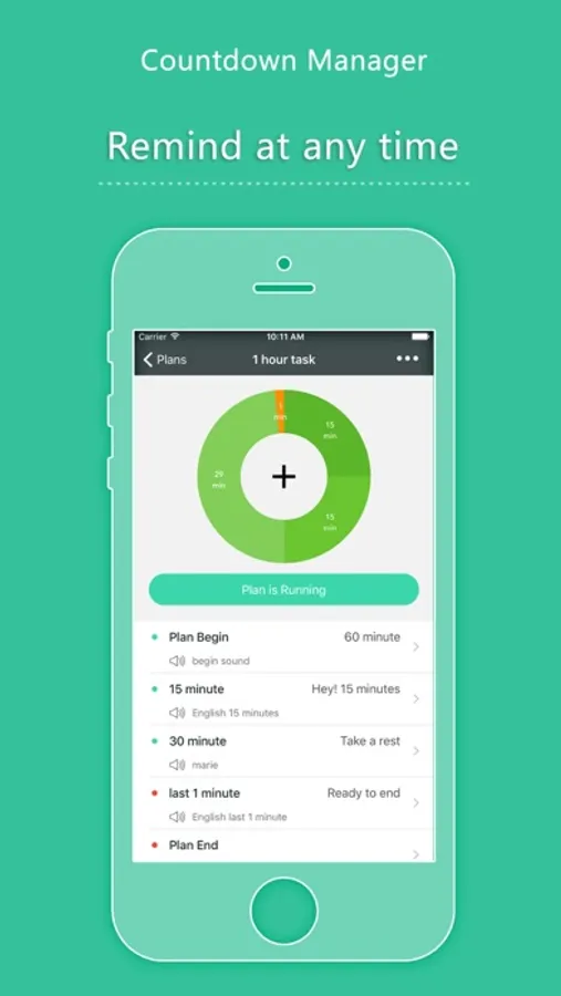 Countdown Manager helps you manage your countdown plans, you can add reminds at a specified time, such as 5 minute or last 5 minutes, you will get a human voice time report at the time.