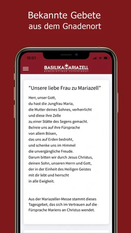 In der App finden Sie für den Ort typische und allgemeine Gebete, Informationen zu den aktuellen Gottesdienstzeiten, Beschreibungen und GPS Daten malerischer, heiliger Orte im Mariazellerland sowie den Audioguide für die Schatzkammern der Basilika.