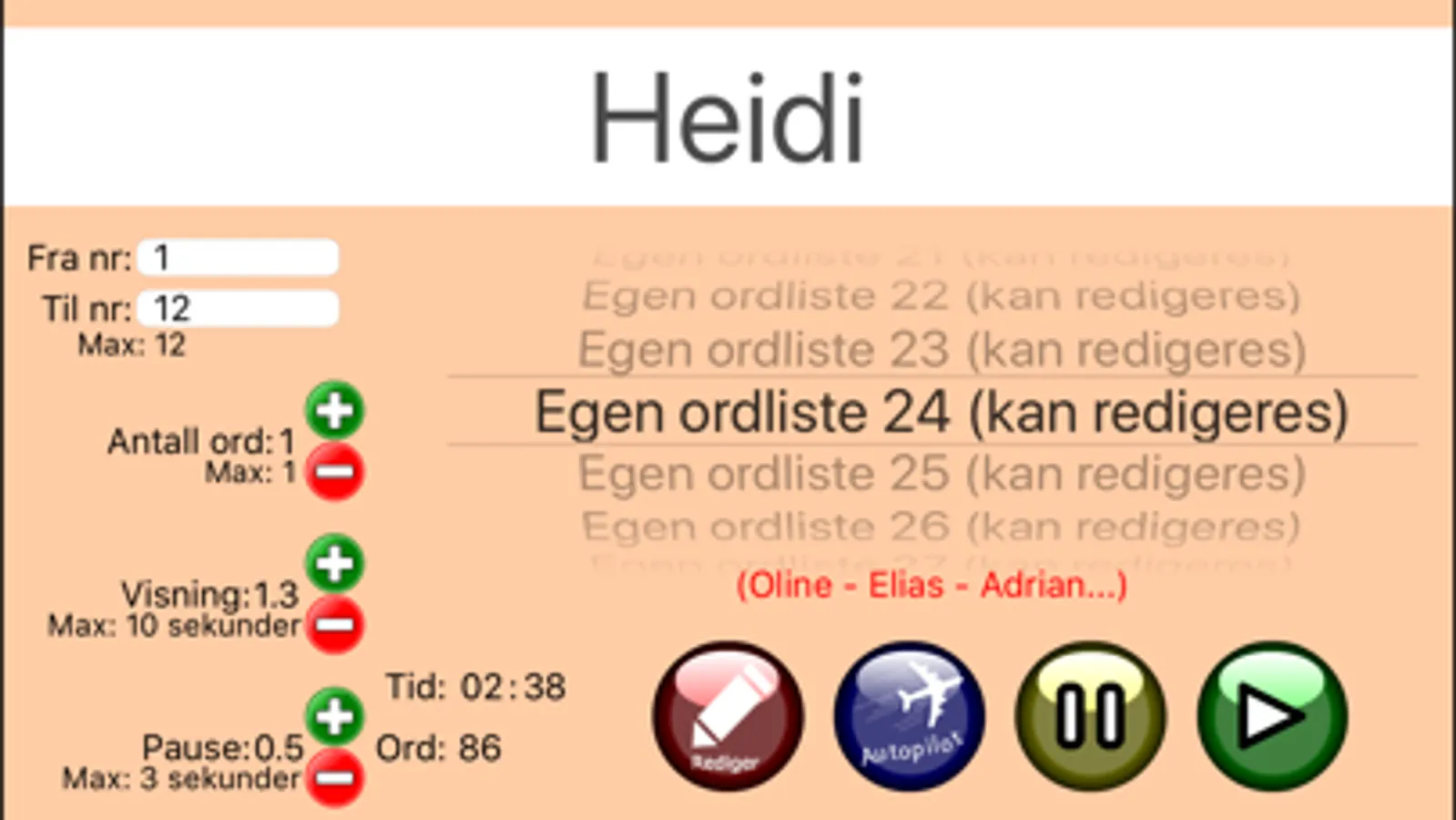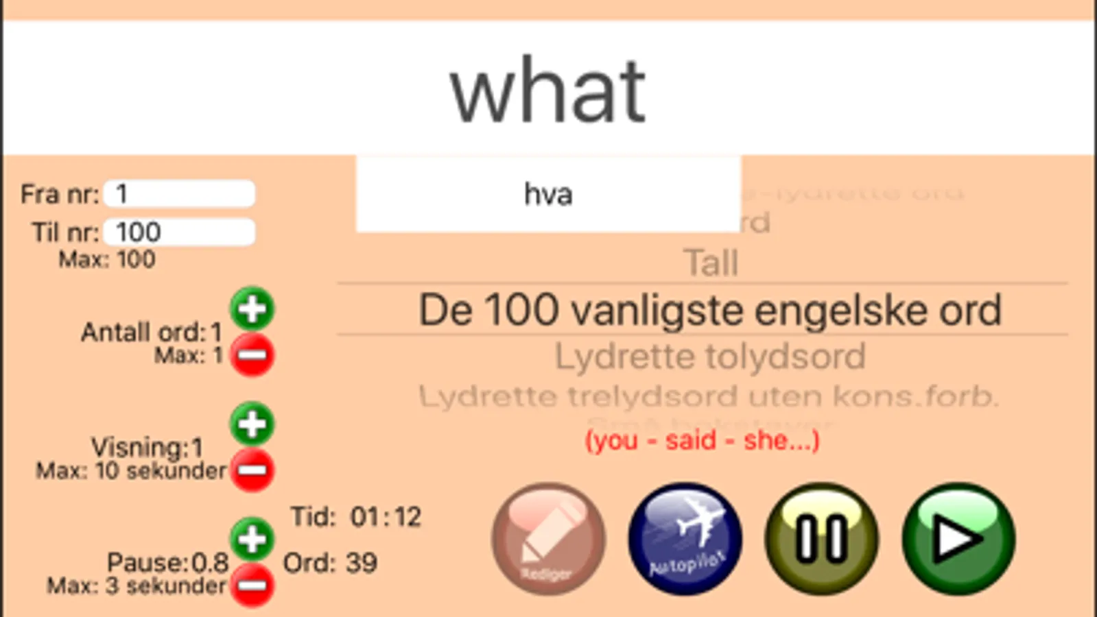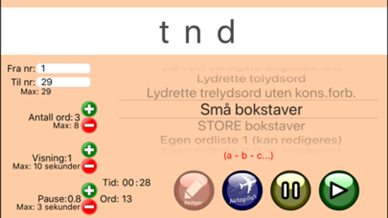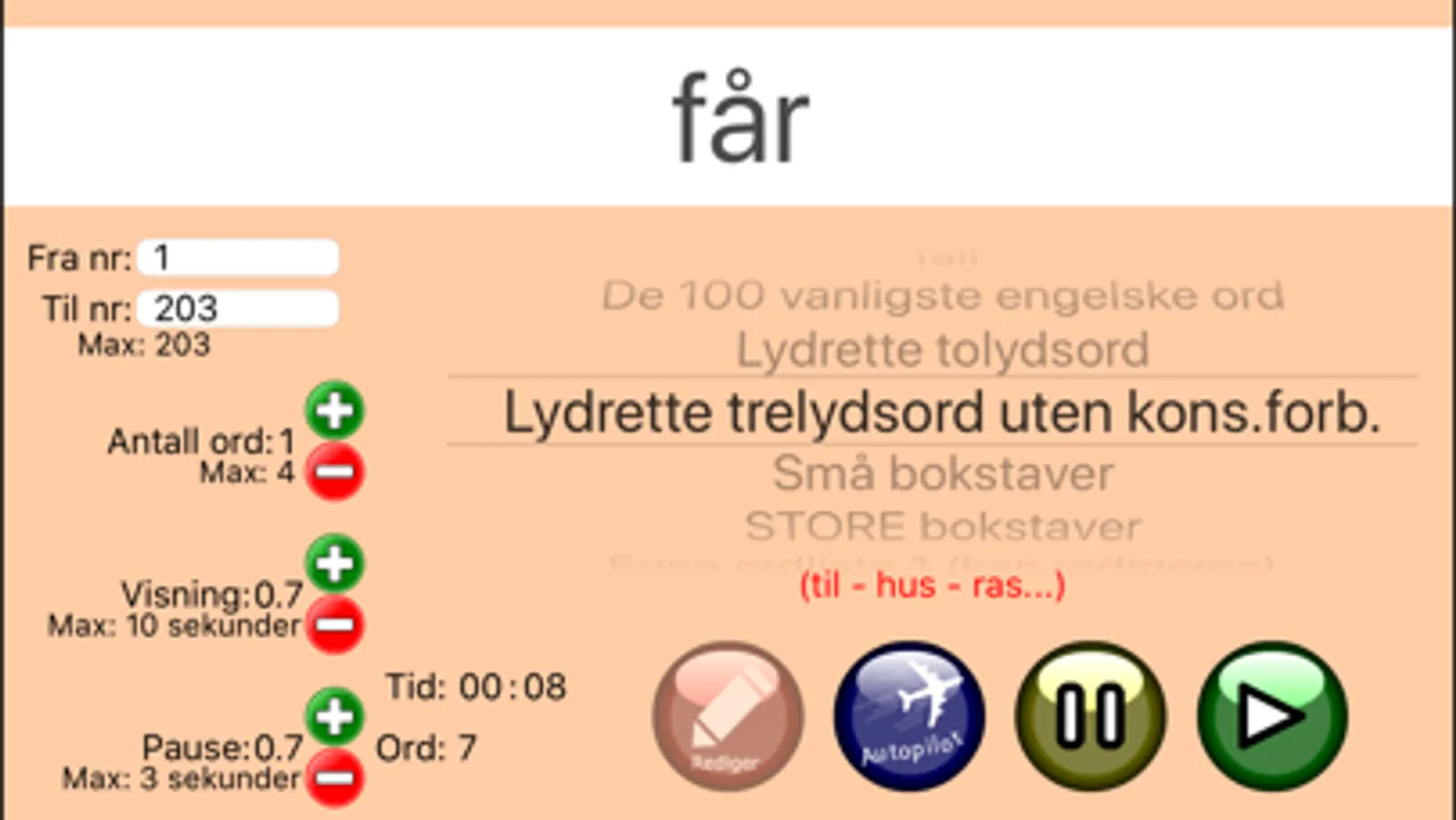 Til skolebruk: "Autopilot"-funksjonen gjør at ordene byttes ut automatisk i et justerbart tempo. Dette er nyttig hvis appen vises på en stor skjerm for hele klassen. Da kan læreren kan bevege seg i klasserommet mens elevene leser i kor.