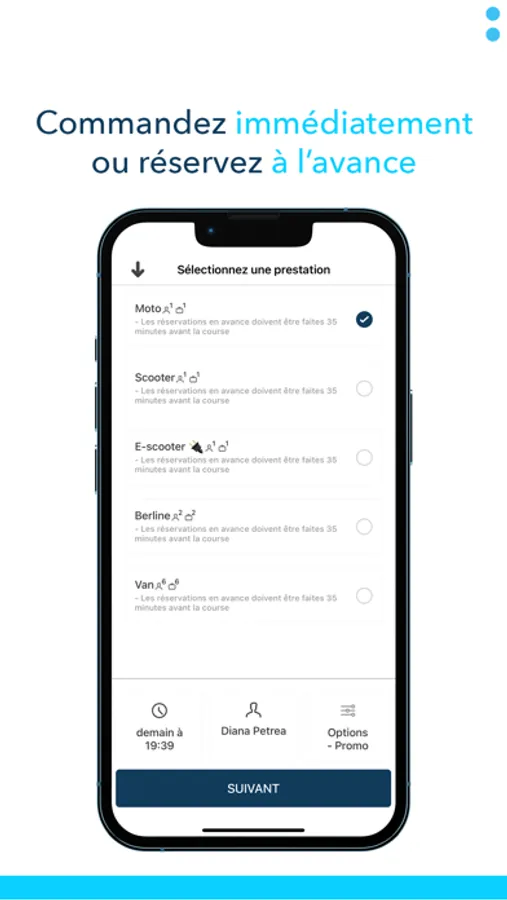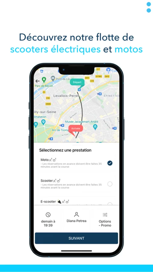 - Entrez une adresse de départ et déplacez le curseur sur la carte : l’adresse s’actualise instantanément sans temps de chargement. - Ajoutez (au besoin) jusqu’à 3 étapes intermédiaires à votre trajet. - Choisissez votre type de véhicule entre scooter électrique et moto. - Validez votre commande et le tour est joué ! *L’astuce pratique ? Nous avons d’ores et déjà prédéfini certains lieux dans l’application (gares, aéroports) de sorte de faciliter encore plus votre navigation.