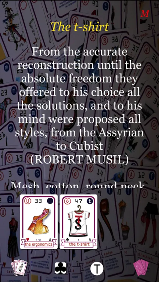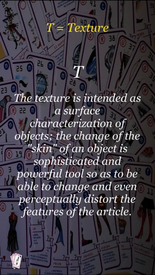 The Sinapsi Compositive are a tool that, initially linked to experimentation and learning at the Accademia di Belle Arti, want to become a "new" contribution to the creativity of the designer and stylist in project implementation. Organized on the structure of French playing cards, have as primary referent the Sibille, the divining cards, especially for graphical relationship between the text and the image. Next, but not least reference, is the series of cards Oblique Strategies by Brian Eno (1948) and Peter Schmidt (1931-1980) edited in 1975. The latter are important for the offer by a series of sentences, collected in more than a hundred different examples, always manage to find a contextualization precisely because of their indeterminacy. In this regard Giulio Mozzi writes that we not accept what the card says but we are confronted with what it says. That's means to see if the instruction or advice from the card can, perhaps paradoxically, maybe in a unachievable way, apply to our case. Perhaps, by reasoning, we will spring something bizarre, something seldom feasible, often something unexpected. This is the logic of the matter: deliberately push our ingenuity and our intuition to address an issue from an unexpected point of view or from unexpected conditions. The important thing is the jolt, not the advice itself.