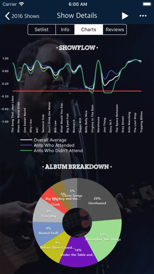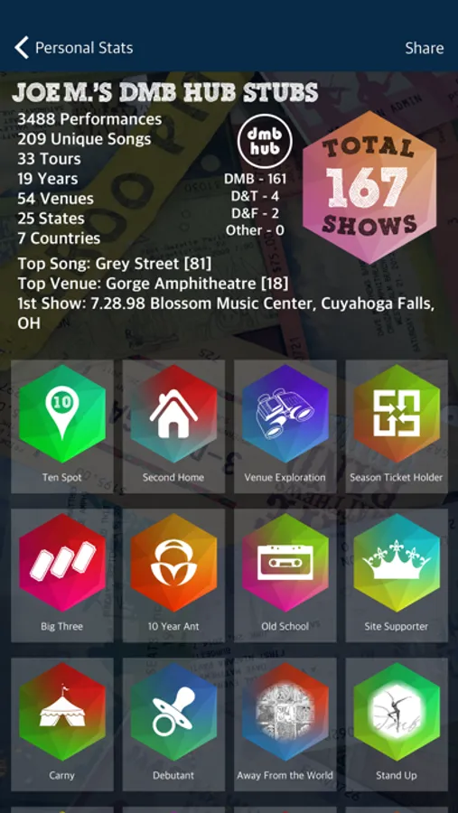 Like to get personal? Log in with your Ants account and track your personal show history and statistics. You can even add shows to your attendance list right from the app. Have a complete catalog of your history with the band right in the palm of your hand! And have even more fun sharing with DMB Hub Stubs! Earn "stubs" based on your tour superlatives!