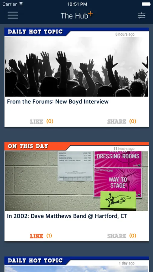 At the core of DMB Hub is simply “The Hub” - a one-stop list of all the current happenings in the DMB world. You’ll find daily DMB history updates, top discussion threads, breaking alerts and other bits of information. All intended to keep your finger on the pulse of the DMB community.