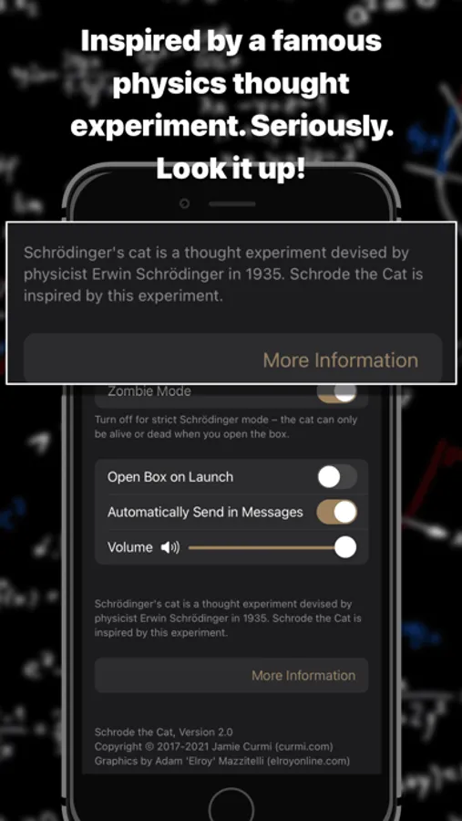 Schrode the Cat is inspired by Schrödinger's Cat – a physics thought experiment devised by physicist Erwin Schrödinger in 1935. You can choose to turn off "zombie mode" to adhere to strict "Schrödinger mode” too if you are a physics nerd, or scared of zombies.