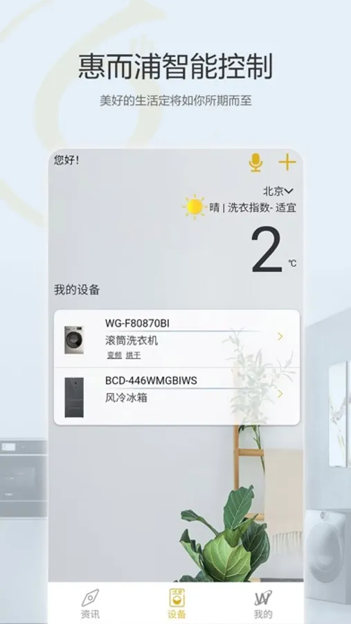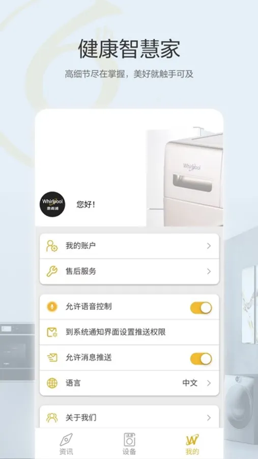 本产品是一款智能设备手机控制端,通过无线网络连接并控制具有联网功能的设备,本产品需要配合惠而浦公司产品使用。