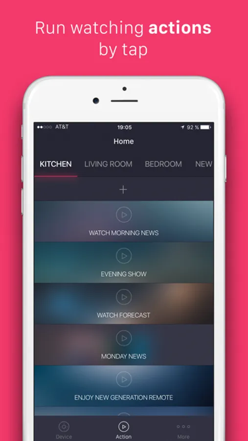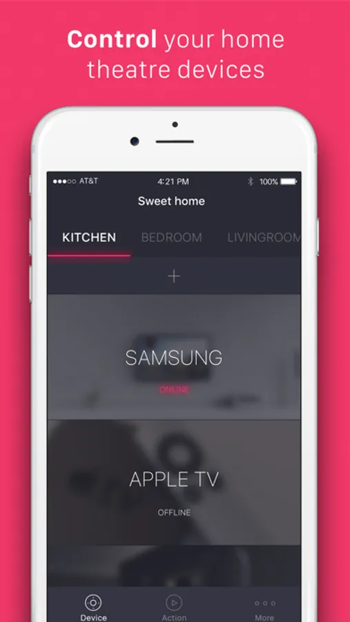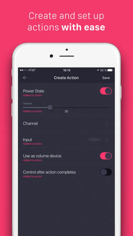 - Create actions with your devices and adjust the settings you want to act together (for example connect your Sony TV and Apple TV, turn them on at once and Sony volume at 8);
