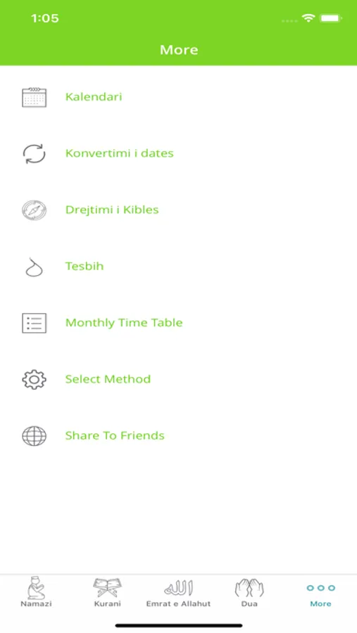 Ky aplikacion përmban shumë karakteristika të dobishme për muslimanët si Mp3 Kur'an Sure, Abdesin, Rekatet, Kalendar, Drejtimi i Kibles, Ditët e Veçanta Islamike, 99 Emrat e Allahut, Dua, Xhamite pranë jush, etj.