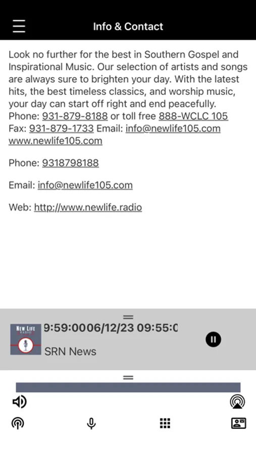 New Life Radio plays the best Southern Gospel music from the artists you love. You'll hear the latest songs from artists such as Greater Vision, Triumphant, Joseph Habedank, Tribute Quartet and so many others as well as classics from the Cathedrals, Imperials, the Happy Goodmans and more. We also air wonderful Christian teaching programs including Focus on the Family Turning Point, In Touch, Insights for Living, Jay Sekulow, and Unshackled, as well as great children's programs like Adventures in Odyssey, the Brinkman Adventures, and the Storybook Room. Listen live 24 hours a day, 7 days a week to WCLC New Life 105 or WGSN New Life 90.7. Enriching, Encouraging, and Inspiring you in your Christian walk.