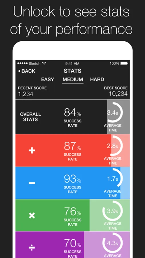 Unlock the full game to view a stats page with information on how well you're answering math problems and how quickly they're solved, as well as a practice mode and additional difficulty levels!