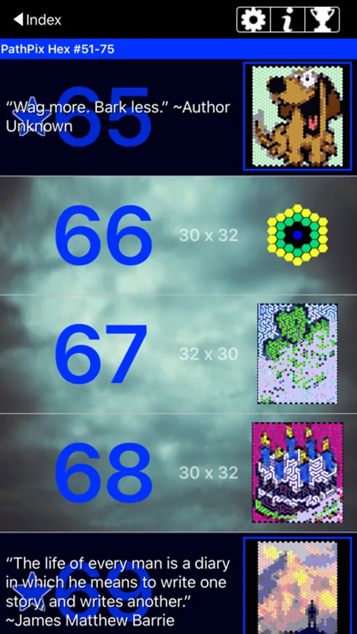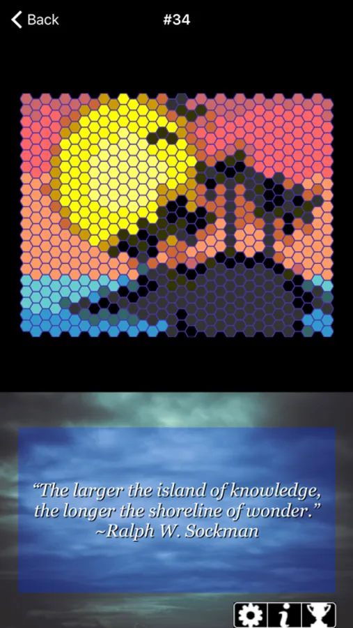 Finish solving to see the miniature picture that you have created. As an extra reward you get a quote related in some way to the picture. Witty or wise, it will give you a little something to think about as you go on to the next puzzle.