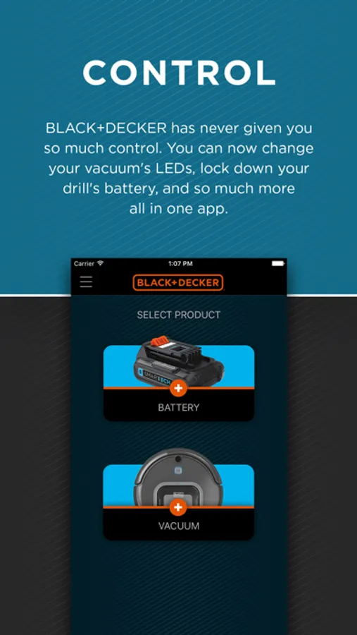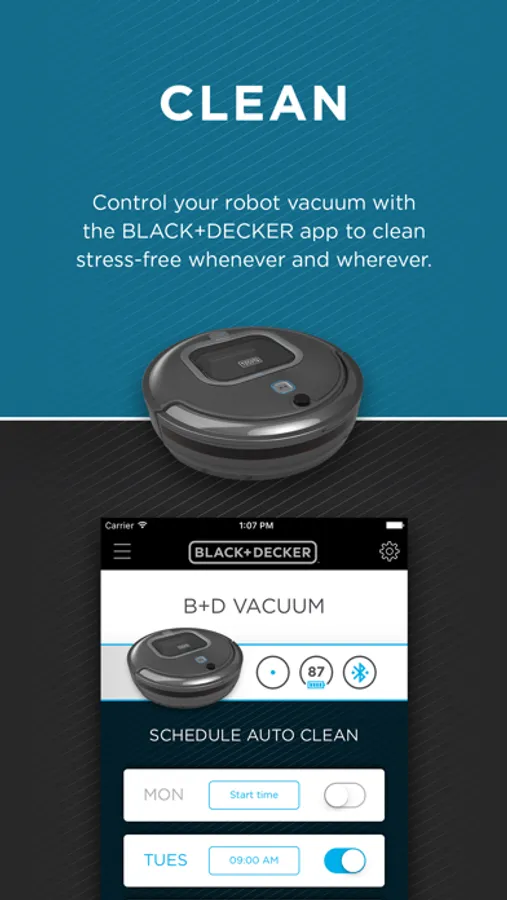 The BLACK+DECKER™ app now supports the all new BLACK+DECKER™ Robot Vacuum and BLACK+DECKER Batteries. You can connect your Robot vacuum with the app via Bluetooth®. Once connected, you can access additional features such as creating and managing cleaning schedules, additional cleaning modes, and direct control of your robot vacuum.